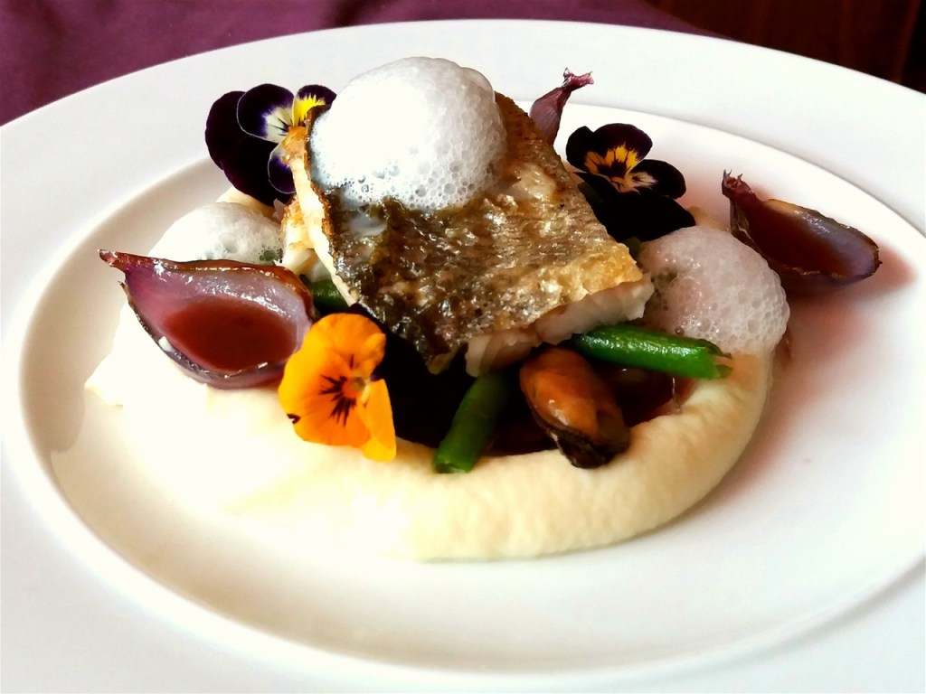 Pentru inceput ne ocupam de fileurile de lup de mare ( daca nu aveti lup de mare va recomand orice file de peste alb pe gustul d-voastra). Dezosam si apoi condimentam cu sare si piper. In acelasi timp, curatam legumele, incepand cu telina , pe care o spalam bine si o taiam in bucatele mai mari. O punem la fiert intr-o oala impreuna cu lapte (folosesc laptele din doua motive: unul, ar fi ca se va pastra o culoare frumoasa, alba si al doilea motiv, va avea un gust deosebit, putin dulceag). Cand telina este aproape gata, punem si un varf de nucsoara si facem o infuzie de aroma. Cat telina este la fiert ne ocupam de fructele de mare care le tragem putin la tigaie in unt si putin ulei pt a ridica punctul de ardere al untului., asezonam cu sare si piper dupa care turnam vinul rosu si facem o reductie de vin (de obicei vin de porto dar puteti folosi orice vin rosu bun ). Telina fiind gata, o pasam printr-o sita fina pentru a avea un piure pufos si fin. Adaugam 50g de unt pentru catifelare siasezonam cu sare si piper. Intr-o tigaie prajim fileurile de peste, prima data pielea in proportie de 80 % la foc mediu pentru a avea o frumoasa crusta dupa care luam o lingura si aruncam untul peste pește. Fasolea verde o blansam pentru 2 minute in apa cu sare, dupa care le tragem la tigaie putin usturoi si unt. In aceeasi tigaie, calim si șalota taiata pe jumatate, pe care o folosim ca decor . Ultimul pas este sa montam farfuria, dupa cum am facut si eu sau cum doriti d-voastra. Fiti creativi si ingeniosi. Mie nu imi ramane decat sa va spun … POFTA BUNA si va astept cu pareri si comentarii.