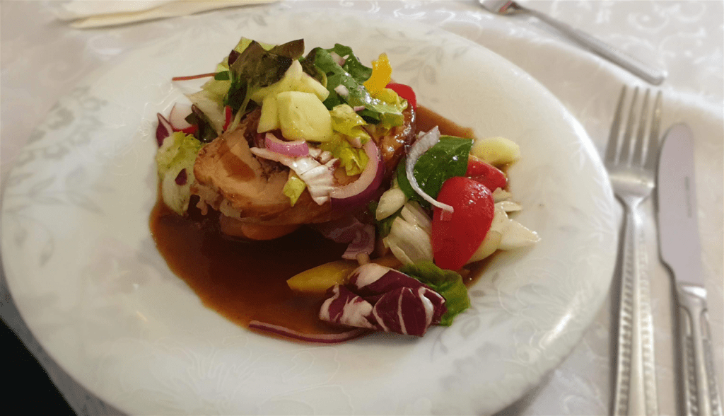 Pentru inceput, luam carnea si o taiam pe lung pentru a avea la final o bucata plata de carne de grosime aproximativ de 1 cm . Dupa care o bat usor cu ciocanul pentru a fi mai frageda si uniforma cat de cat. Condimentam cu sare, piper si cimbru, dupa care un strat de mustar boabe ca in filmuletul de sus. Din carnaciorii proaspeti scoatem carnea condimentata si o punem in rulada noastra. In continuare, rulam cat mai strans posibil si la urma in feliile de proschiutto crudo cu ajutorul foliei de prospetime. Mai rulam intr-o folie de aluminiu si va merge in cuptorul incins 160 de grade pentru inceput intr-o tava de copt cu apa, timp de 30minute. Urmeaza sa ne ocupam de garnitura. Ceapa o taiem solzisori si o calim pana se inmoaie. Merele le spalam si le taiem sferturi, dupa care le punem impreuna cu ceapa si le calim pana se inmoaie putin. Asezonam cu sare si piper apoi aruncam si putin de unt si o lingura de zahar pentru caramelizare. Ne intoarcem la rulada noastra pe care o scoatem din cuptor si indepartam toate foliile cu grija dupa care o lasam din nou la cuptor pentru a forma o crusta crocanta si sa finalizam gatitul. Inca 35 minute la cuptor, apoi se lasa la odihnit cca 15 minute inainte sa feliem rulada. Montarea farfuriei este foarte simpla, fiecare dupa preferinte lui. Se poate servi cu un sos brun si o portie generoasa de salata verde. .Mie nu imi ramane decat sa va doresc POFTA BUNA!