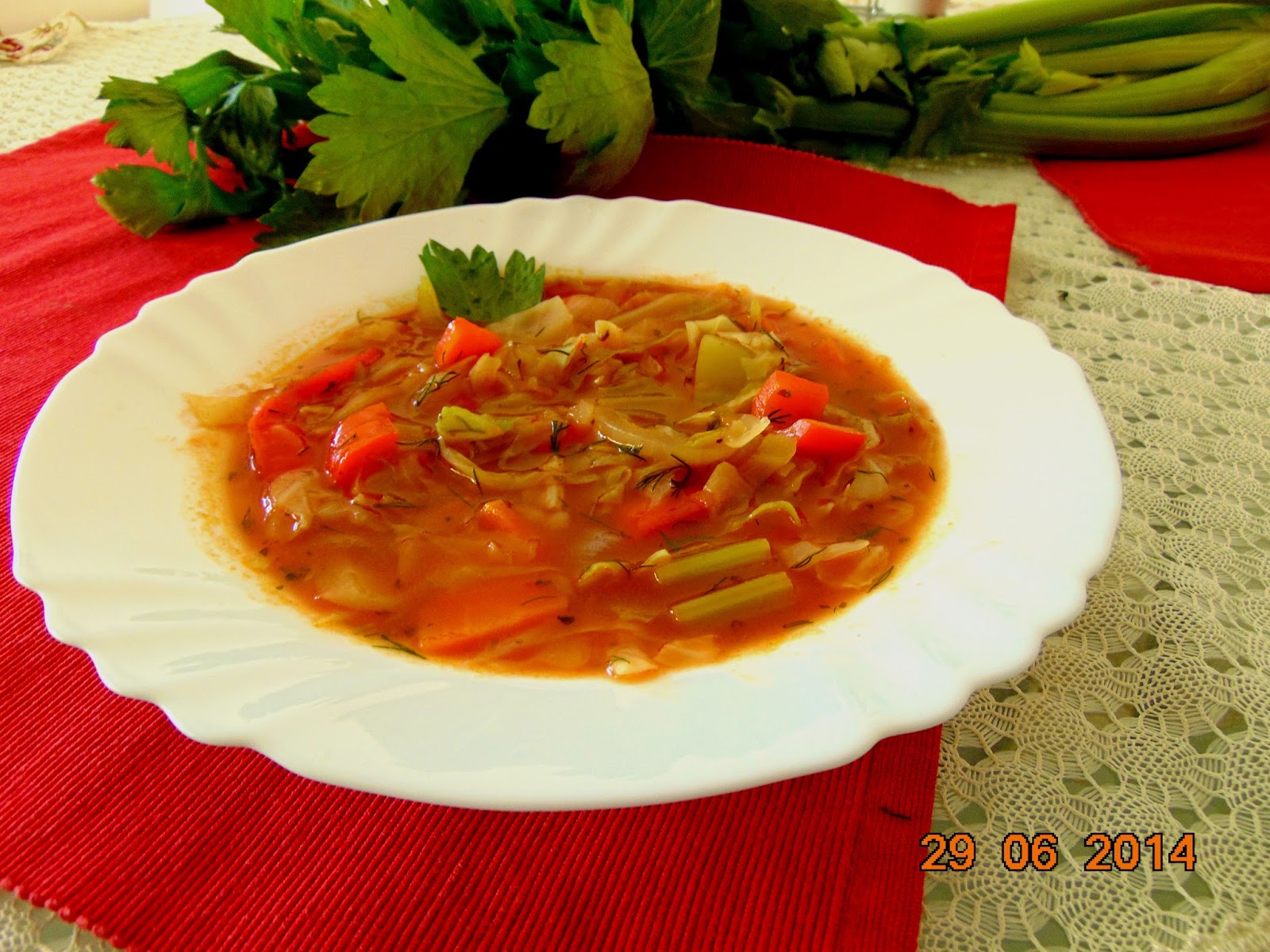 Intr-o tigaie incinge 2 linguri de ulei masline si vom cali 2-3 minute ceapa tocata marunt impreuna cu catelul de usturoi, pana cand ceapa devine translucida. Varza tocata fideluta o vom freca cu putina sare si o vom lasa timp de 10 minute sa se inmoaie dar va ramane crocanta.Daca ceapa s-a gatit, vom adauga morcovul taiat rondele il vom cali timp de 3-4 minute, apoi punem ardeii grasi taiati bucati si mai lasam 3-4 minute pana incepe sa se inmoaie. La final adaugam si varza noastra impreuna cu telina apio taiata 2-3 cm bucati. Lasam totul circca 10 minute apoi reducem focul si adaugam condimentele, sucul de rosii, o cana de supa de carne si lasam la fiert la foc mediu timp de 25 minute. Daca doriti pentru mai multa savoare puteti adauga un cub de knorr de pasare sau orice doriti dumneavoastra.Aproape cand este gata supa noastra o gustam si adaugam sare si piper dupa preferinte si legatura de marar tocat fin. Nu imi ramane decat sa va doresc …