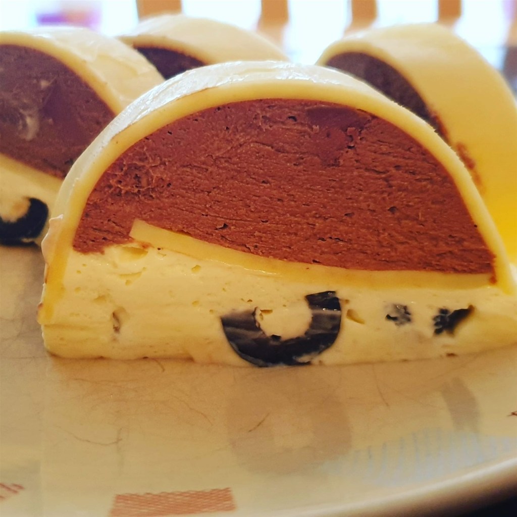 Se călește ficatul cu 2 lg ulei și 50g unt, când este pe jumătate gătit punem cogniacul si lăsăm sa se evapore alcoolul. Apoi adăugăm si ceapa și usturoiul, sare, piper, cimbru și lăsăm la foc mediu până se gătesc toate. Lasam la răcit cam 5-6 min, apoi punem într-un vas, ficatul, 50g de unt la temperatura camerei, frișca lichida și blendam până obținem o pastă omogena. Într-o formă de terina tapetată cu folie de prospețime (eu am folosit una de 25cm), asezam feliile de brânză gouda și le ungem cu puțin unt topit, apoi turnam pateul obținut. Opțional, putem pune inca un rând de felii de brânză. Pentru crema de branza punem într-un vas branza tartinabila, gelatina hidratată în prealabil și dizolvată la 60 de grade, restul de unt, sare, piper si alte condimente preferate și omogenizat foarte bine. Turnam peste pateu, nivelat foarte bine și încheiem cu alte felii de gouda. Lasam la rece peste noapte. In crema de branza eu am pus măsline, dar putem pune firisoare de chives).